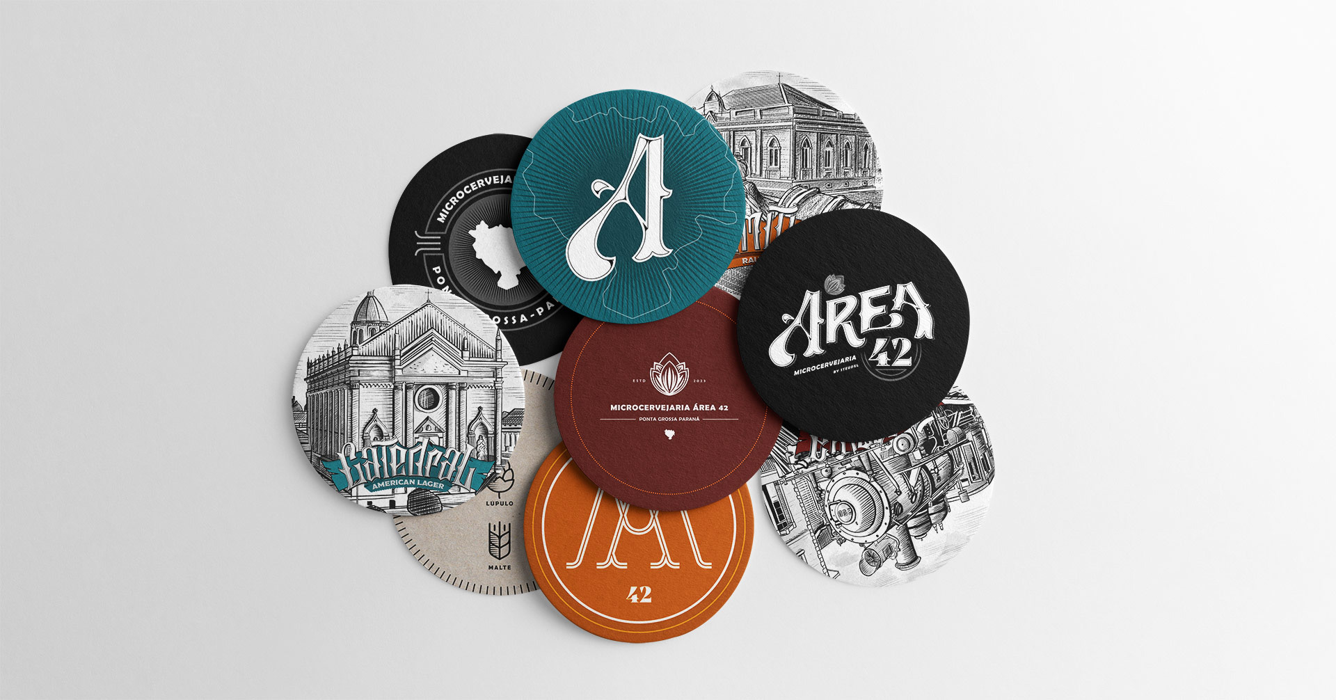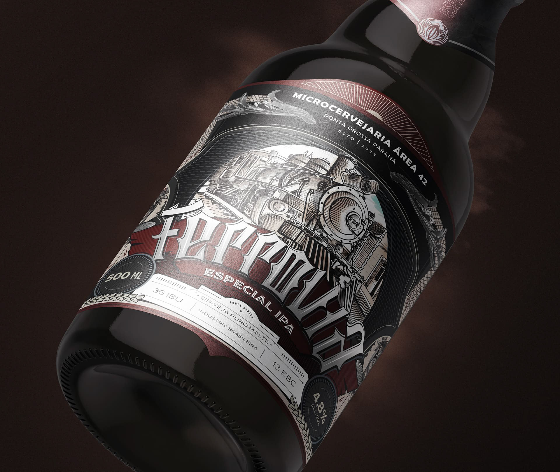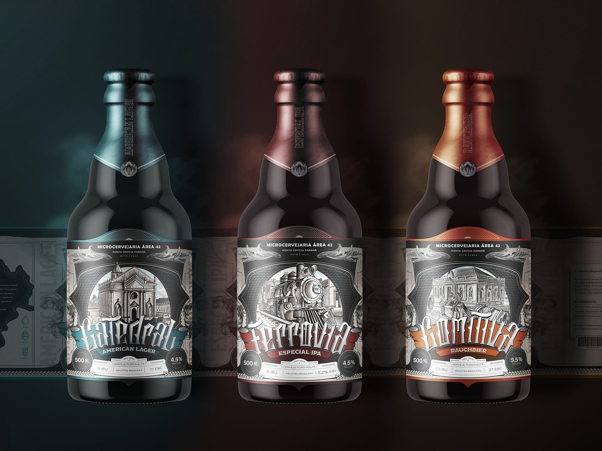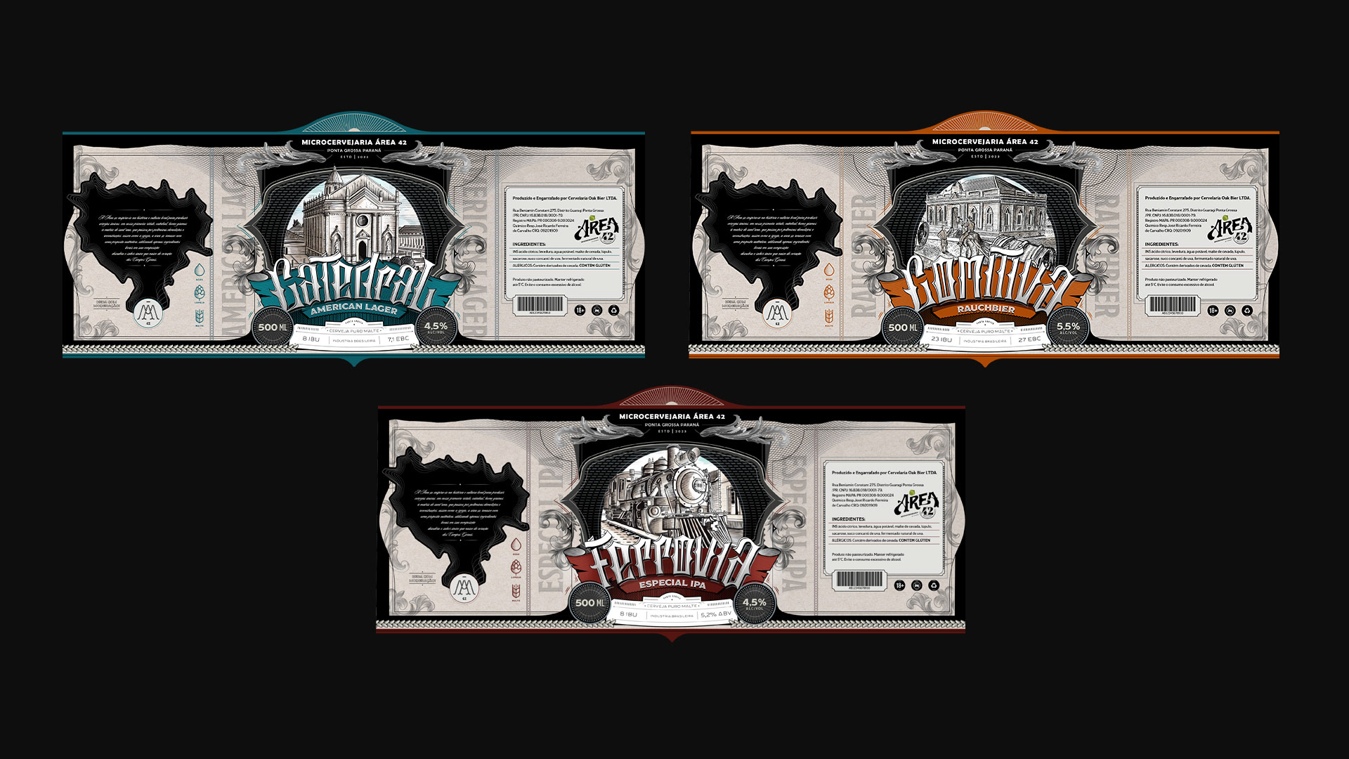 Trabalho realizado para a microcervejaria de Ponta Grossa-PR Área 42, uma cervejaria artesanal com muita história e bagagem na produção de cerveja, que assim como eu, amantes dessa bebida saborosa. Neste trabalho procurei desenhar o rótulo todo, pois se trata de um produto muito artístico e manual, que carrega em si uma bela representação local. Trouxe para a parte frontal das garrafas a catedral e a ferrovia, símbolos históricos da cidade.