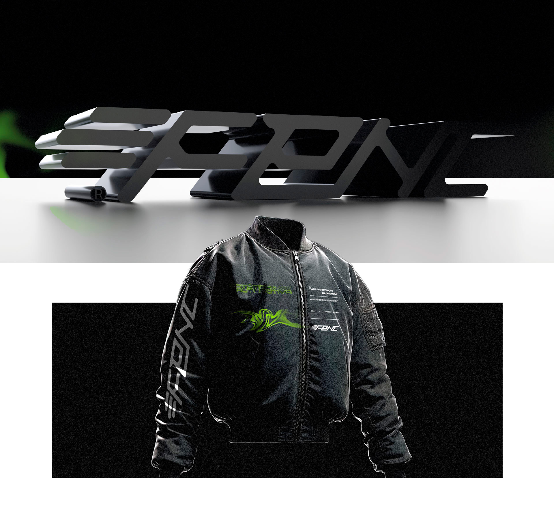 A tipografia principal da Fenc foi desenhada exclusivamente para a marca, destacando sua originalidade e elegância. Com cantos suavemente arredondados e uma inclinação sutil, ela combina simetria e movimento, refletindo dinamismo e precisão, características que definem o universo automotivo de luxo e alto padrão.